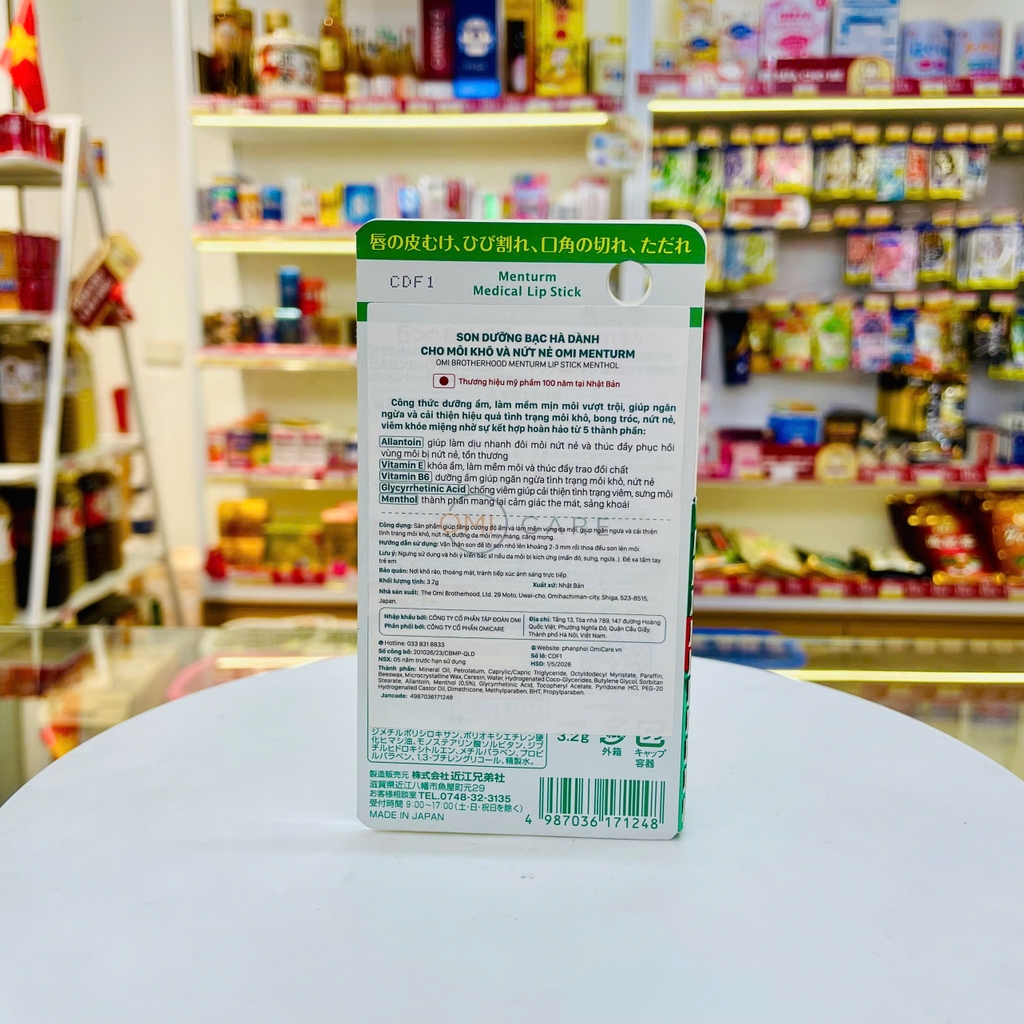 Son dưỡng bạc hà dành cho môi khô và nứt nẻ OMI MENTURM là Son dưỡng môi duy nhất tại Nhật Bản chuyên biệt cho tình trạng viêm bờ môi, khóe môi với công thức dưỡng ẩm và chăm sóc chuyên biệt nhờ kết hợp hoàn hảo từ 4 thành phần: