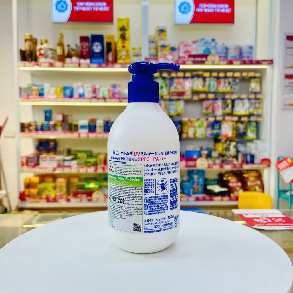 Sữa Dưỡng Thể Chống Nắng Hatomugi SPF31 PA+++ Nhật Bản 250ml mới được tung ra thị trường đã được rất nhiều đón nhận của chị em phụ nữ. Sản phẩm vừa có tác dụng làm kem dưỡng ẩm , dưỡng trắng da vừa có tác dụng là kem chống nắng , sử dụng cho cả body và mặt đều được. Sữa dưỡng thể Hatomugi SPF31 PA+++ đang nổi đình đám nhờ công dụng siêu tiện lợi lại ở một mức giá hợp lý không thể chê vào đâu được.