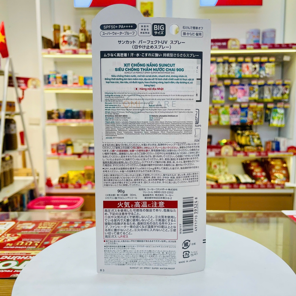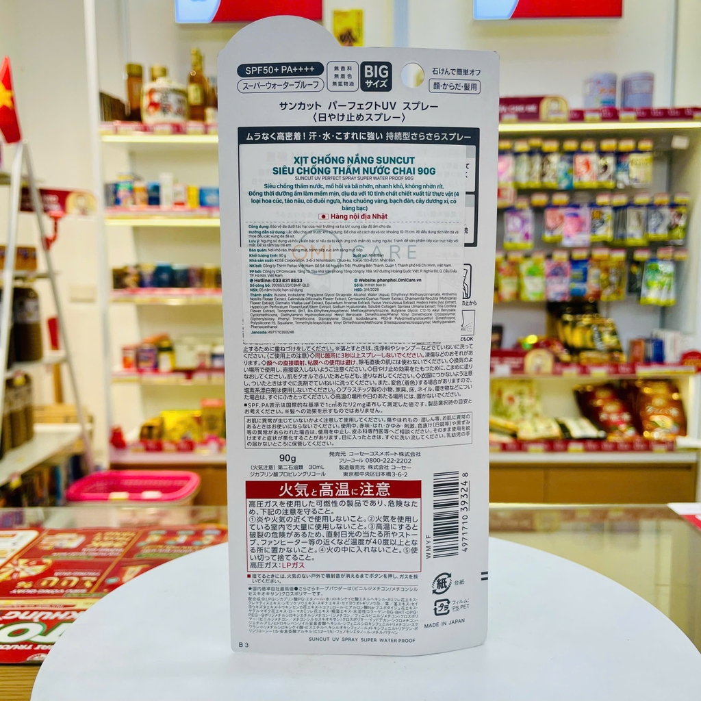 Xịt chống nắng với chỉ số chống nắng vượt trội SPF50+, PA++++ giúp bảo vệ da khỏi tia cực tím có hại. Tạo lớp màng bảo vệ da khỏi các yếu tố có hại trong môi trường xung quanh như bụi bẩn, phấn hoa... Kết hợp 10 loại chiết xuất thực vật cùng Hyaluronic acid, collagen, squalane… cấp ẩm sâu cho da, không khô da, cho da luôn ẩm mượt tự nhiên. Với công nghệ siêu chống thấm nước, giúp chống trôi hiệu quả, tăng cường bảo vệ da, ngay cả khi đổ mồ hôi, tiếp xúc với nước, khuyên dùng cho người thường xuyên hoạt động ngoài trời, chơi thể thao dưới nước. Lớp chống nắng mỏng nhẹ, thông thoáng, không gây nhờn rít, bức bí da. Chai xịt tiện dụng, có thể xịt khi dốc ngược chai. Thích hợp dùng cho mặt, toàn thân và tóc, có thể tẩy trang bằng sữa rửa mặt, sữa tắm... HDSD: Dùng buổi sáng hoặc trước khi ra nắng và thoa lớp nền, nhẹ nhàng thoa khắp mặt và toàn thân. Nên thoa lại sau khi dùng khăn lau, đìều này đảm bảo tối ưu việc bảo vệ da khỏi tác hại từ tia UV. Nếu dùng cho da mặt, vui lòng xịt vào lòng bàn tay và dùng lòng bàn tay thoa đều khắp mặt.